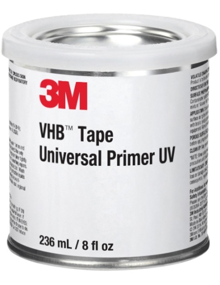 3M™ VHB™ Tape Universal Primer UV offers an improved environmental, health, and safety profile compared to 3M™ Primer 94. This is resulting from not intentionally added aromatics including Toluene, Xylene, Chlorobenzene, as well as halogens including chlorinated compounds. 3M™ VHB™ Tape Universal Primer UV features a UV indicator which makes it visible under UV light. It allows for verification of primer application, reducing the chance of priming errors and increasing quality control. It is specifically formulated for quick drying time which helps to increase speed and productivity. Promote adhesive on load bearing bonds with low impact formulation. 3M™ VHB™ Tape Universal Primer UV is specifically designed to promote bonds of 3M™ VHB™ Tapes on many difficult to stick to substrates such as plastic, painted and bare metal substrates. It may be applied with a brush, swab, or felt-tipped dauber bottle applicator, knurled roller or similar type of equipment and can be removed with acetone.