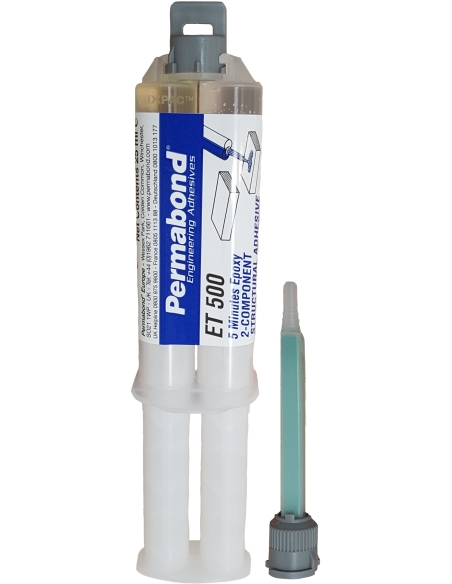 PERMABOND® ET500 is a two-part fast-setting epoxy adhesive which bonds to a wide variety of substrates such as wood, metal, ceramics and some plastics and composites. It cures rapidly at room temperature to